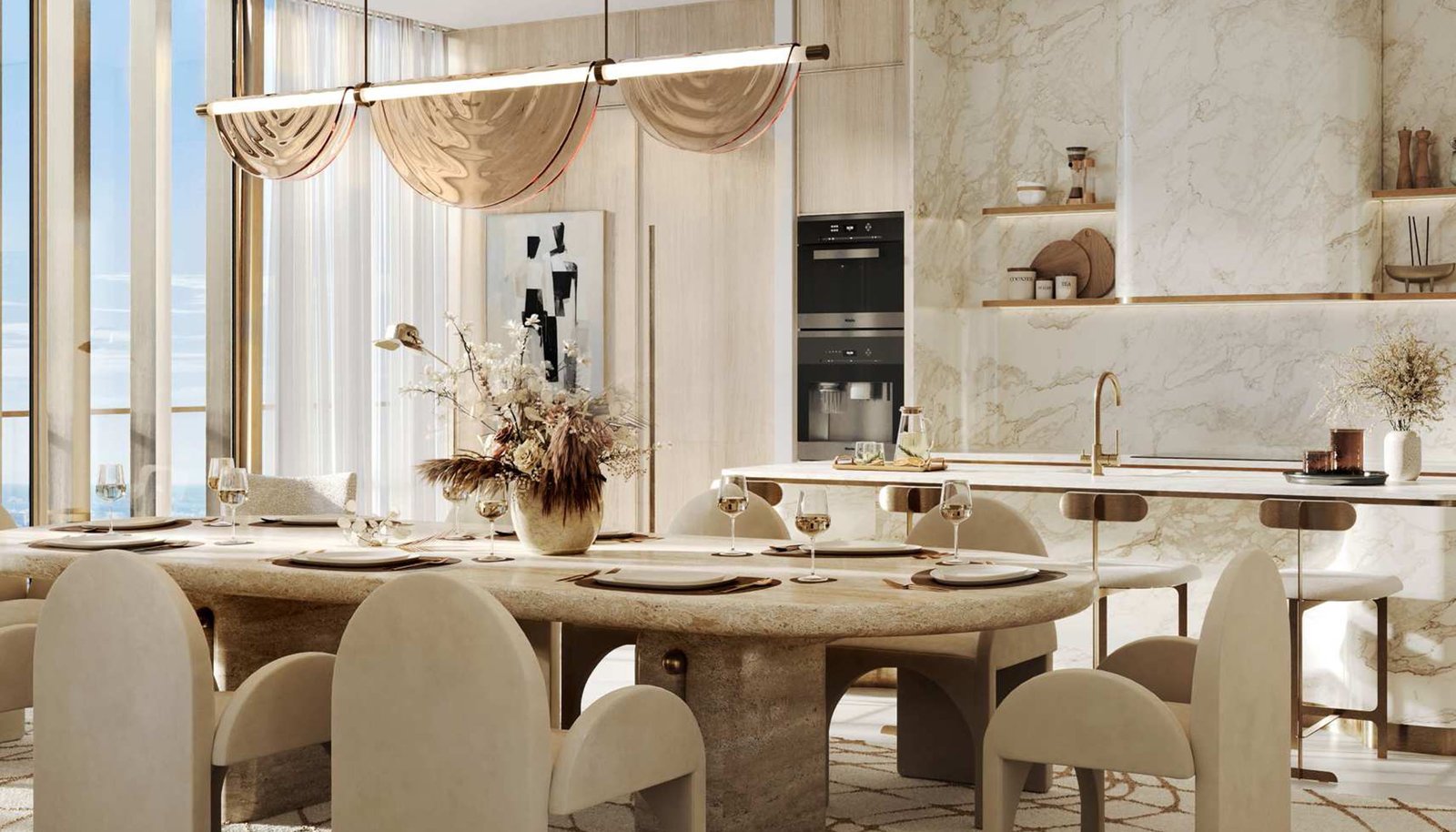 Each residence is a masterpiece of design, featuring custom furnishings, marble finishes, retractable panoramic windows, and spacious living areas. Kitchens are fitted with premium appliances, while opulent bathrooms include soaking tubs with stunning skyline views.