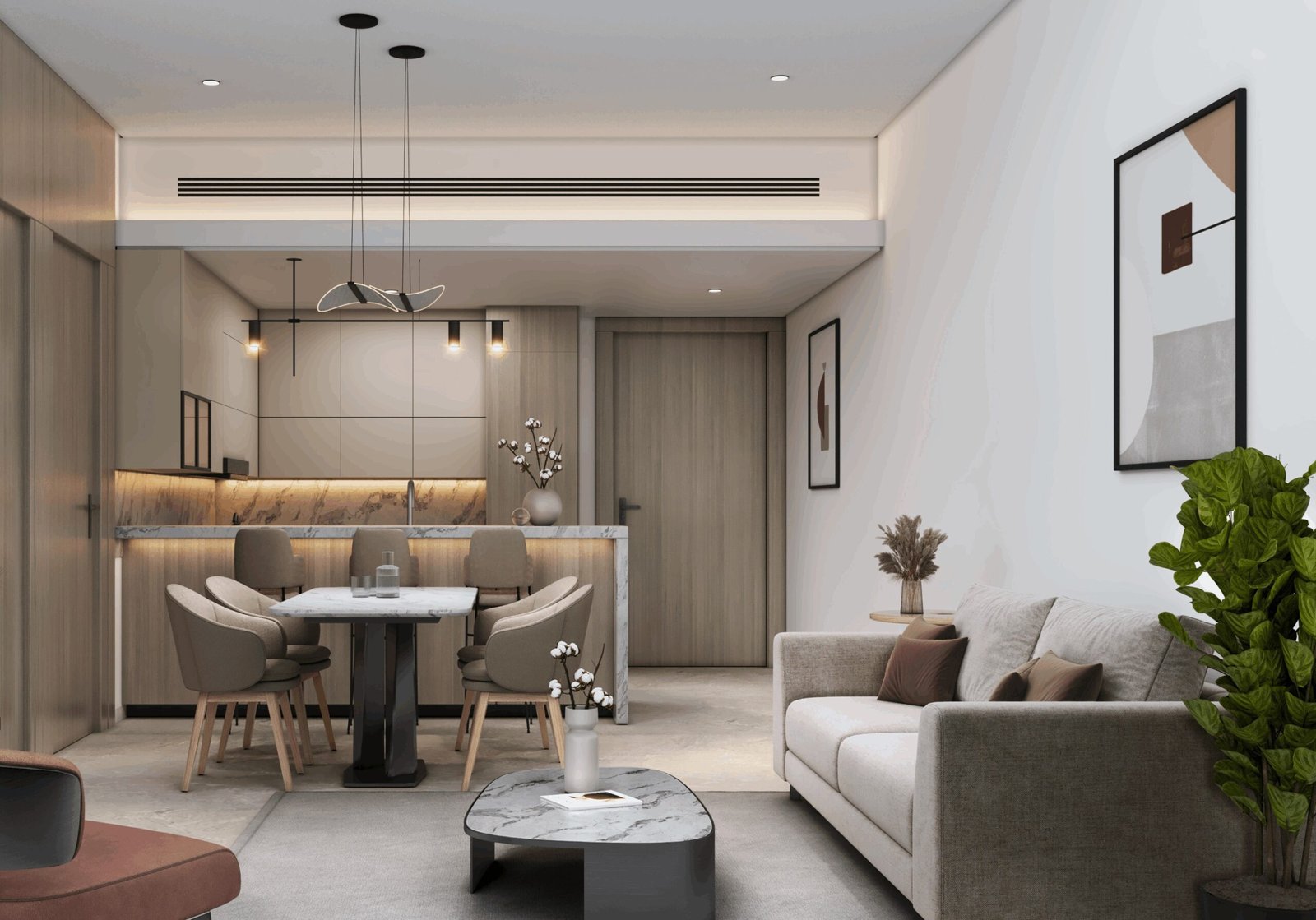 • 1-Bedroom Apartments: Perfect for couples or small families, offering spacious living rooms, bedrooms, and open kitchens.