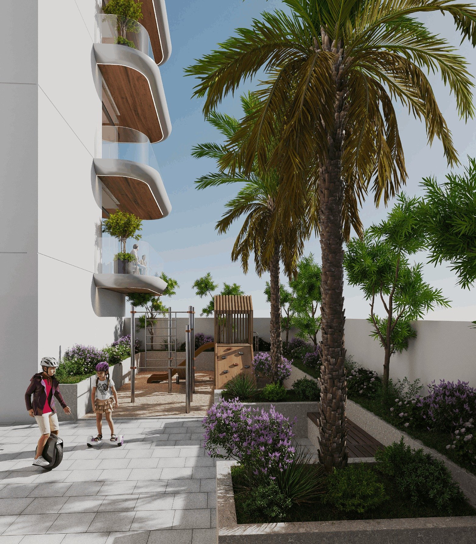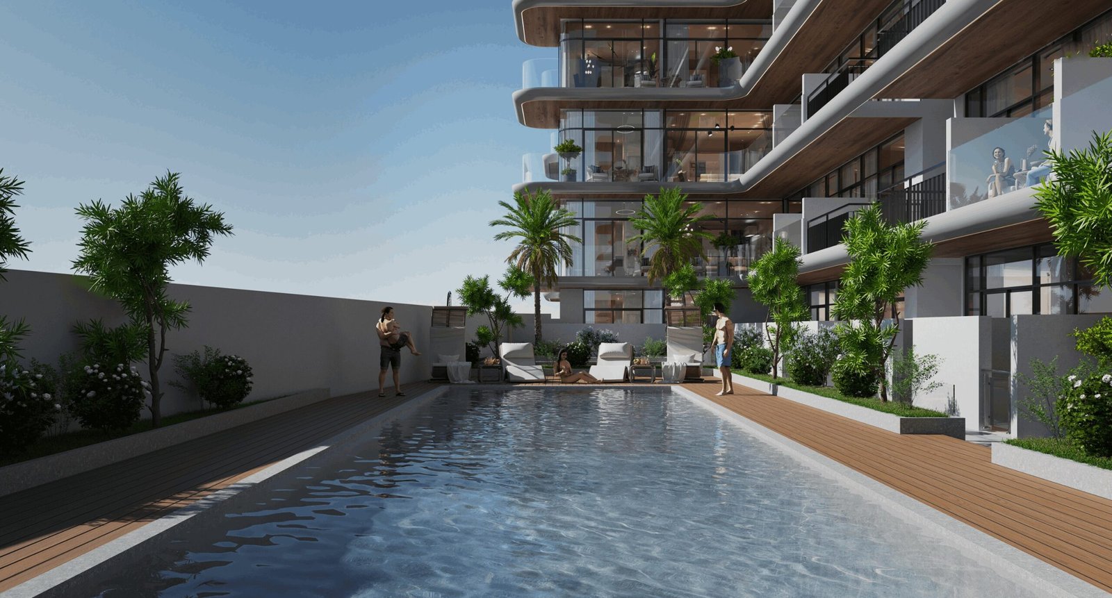 A rooftop swimming pool offers a refreshing escape, while a separate children’s pool ensures a safe and fun environment for young residents.