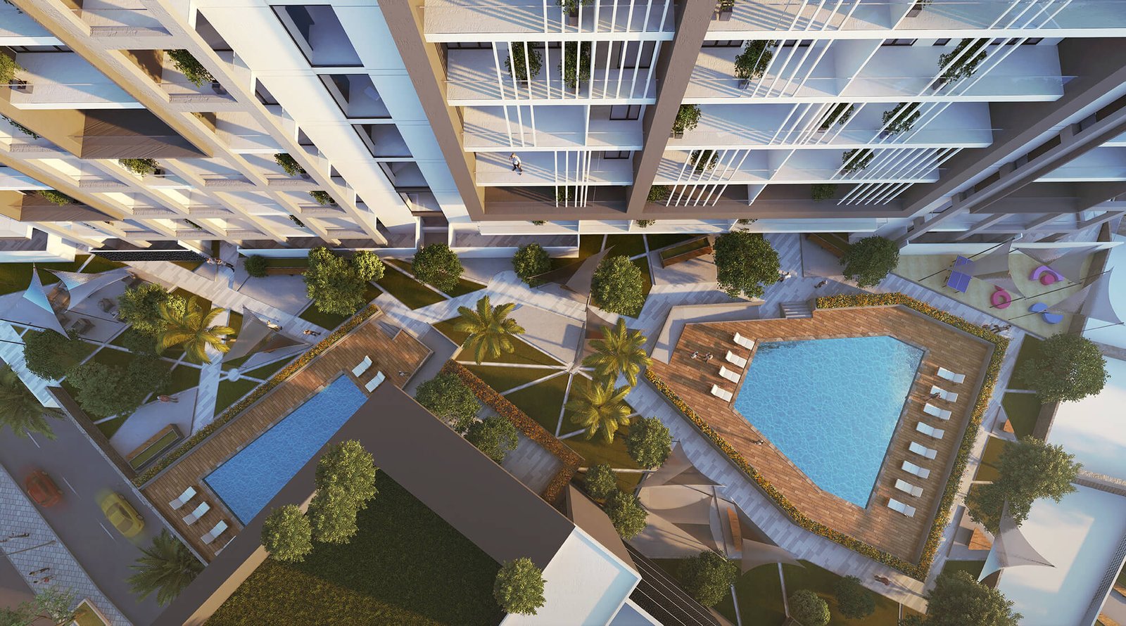 Swimming Pools: The development features a large swimming pool for adults and a children’s pool, ensuring relaxation and family-friendly recreation.