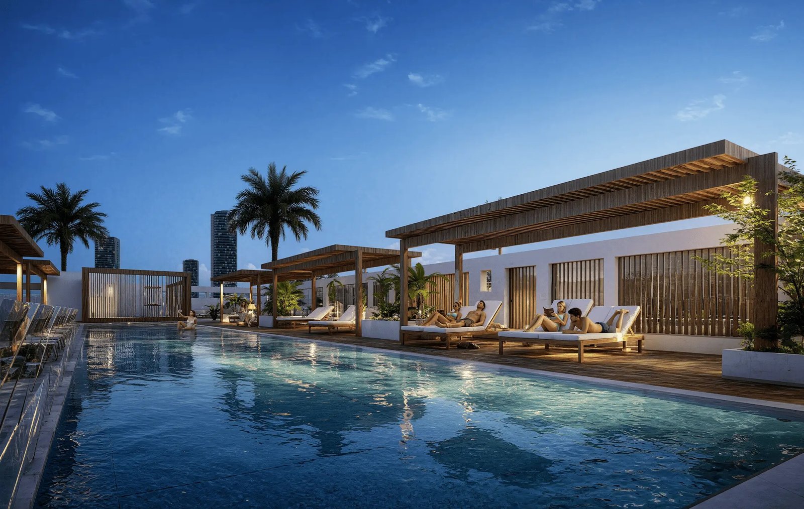 A stylish deck surrounding the pool with seating areas for sunbathing and social leisure.