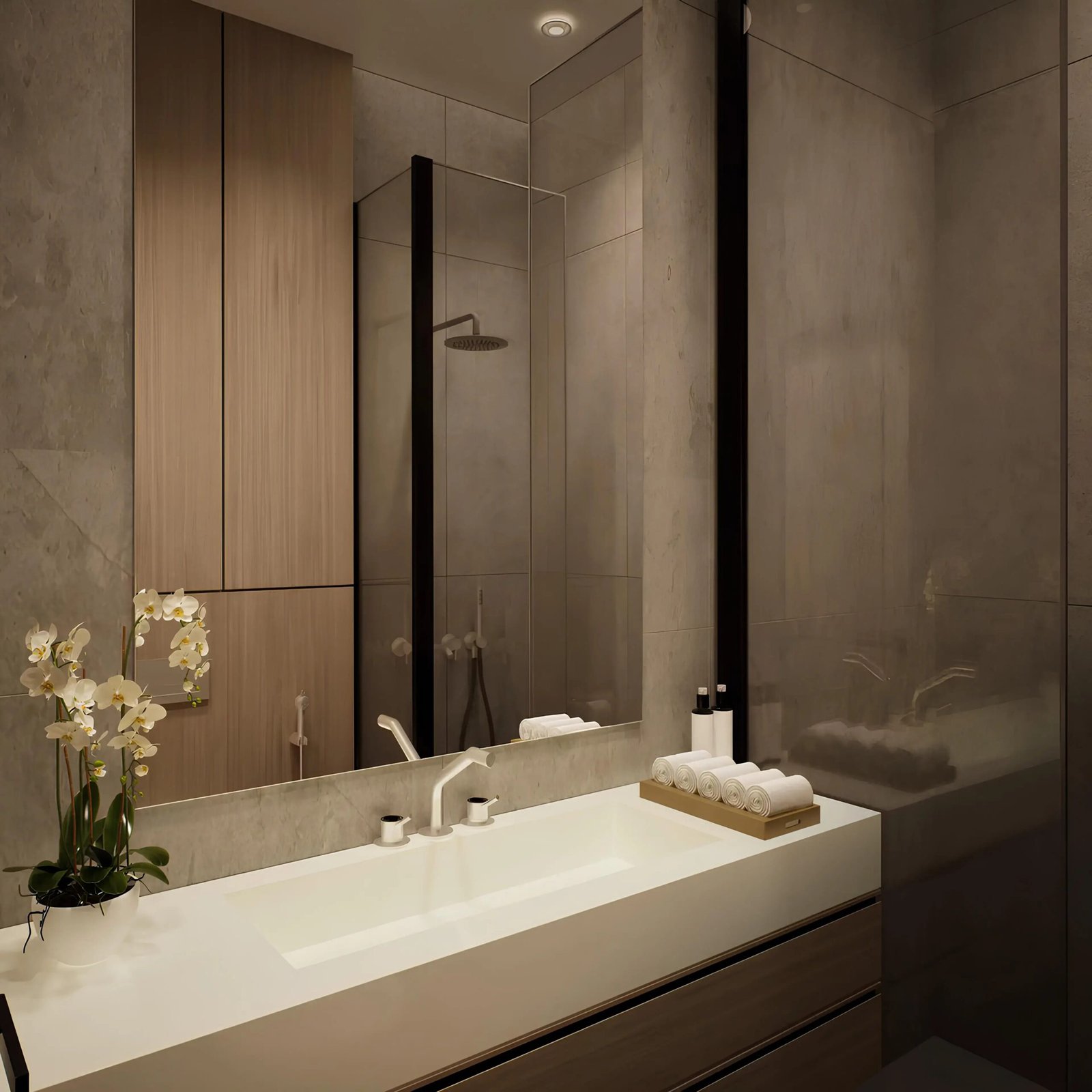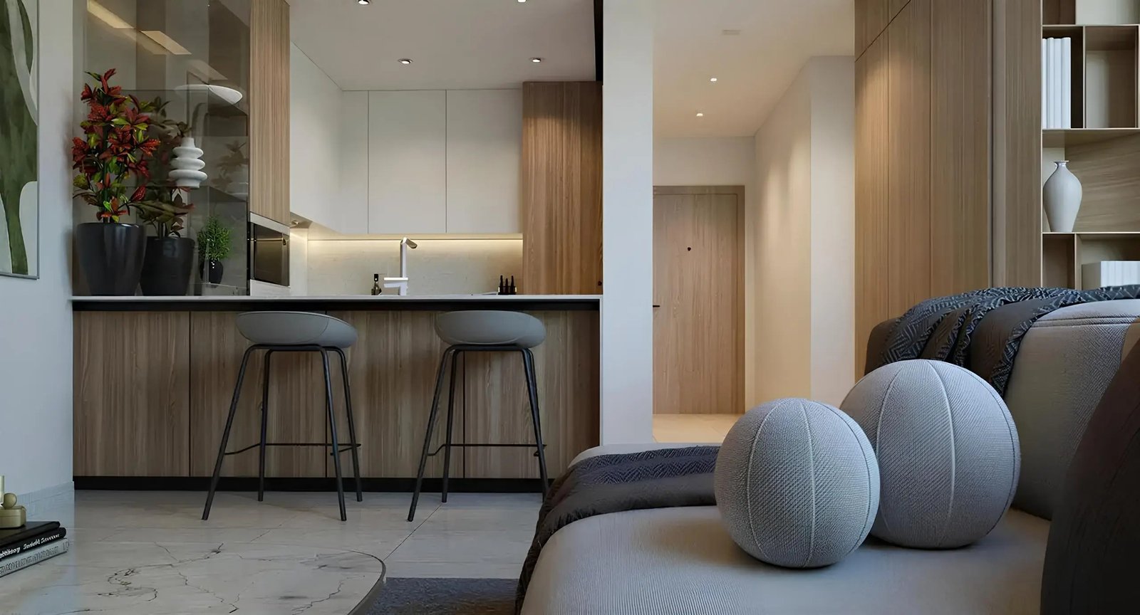 Aria Heights offers a selection of studios, 1-bedroom, 2-bedroom, and 3-bedroom apartments. These units stand out for their bright interiors, generous layouts, panoramic glazing, and elegant finishes. Premium materials such as Italian tiles, wooden decorative elements, energy-efficient lighting, and European bathroom fixtures from brands including Gessi, Geberit, and Flaminia are used throughout. Kitchens are fully fitted with high-quality built-in appliances by Siemens and Smeg.