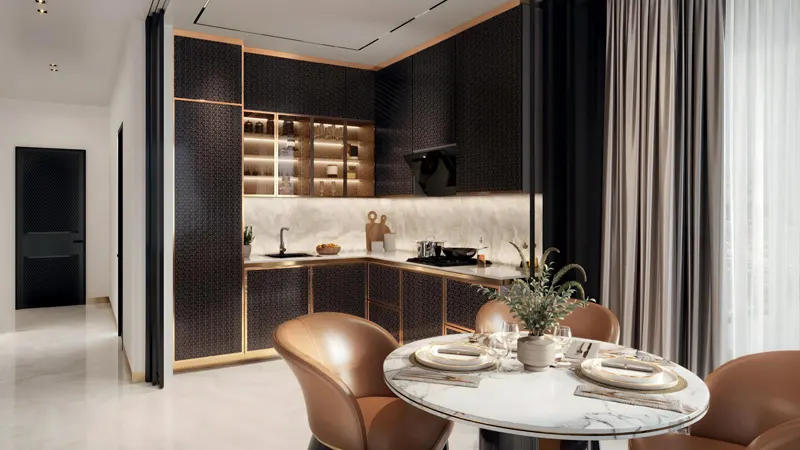 The tower features studios, 1–4 BR apartments, presidential suites, and luxury 5 BR penthouses, all furnished with Italian furniture, multifunctional kitchens, Black Marquina marble finishes, and gold accents. Every unit is designed to maximize natural light through floor-to-ceiling windows, creating bright, expansive living spaces.
