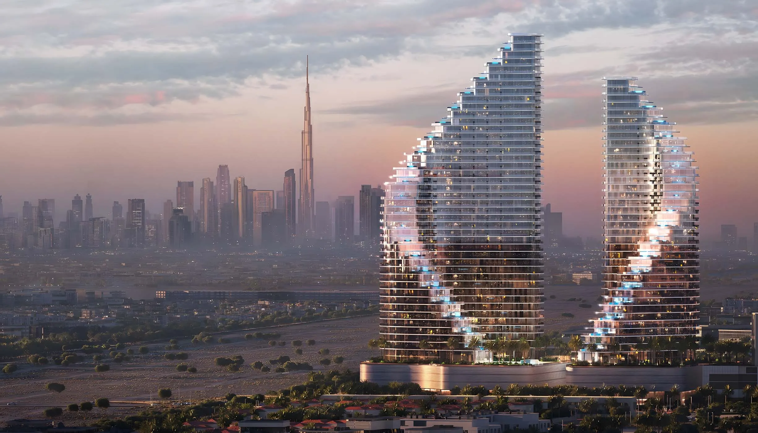 - Sculptural, luminous twin towers with signature Binghatti architectural design