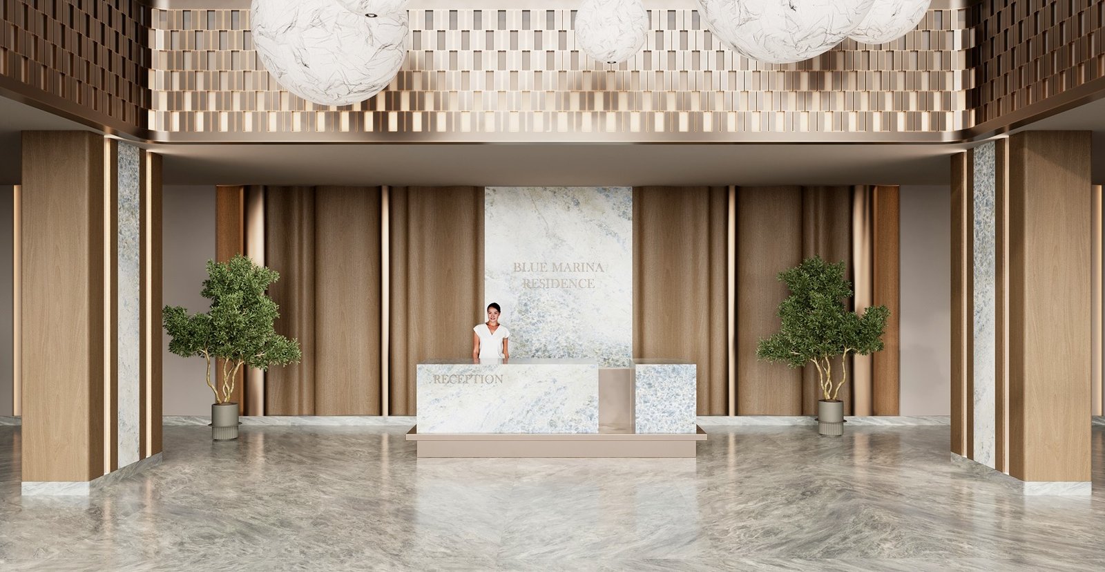 A sophisticated lobby area creates an inviting entry point with modern design elements that reflect the elegance of Blue Marina Residence.