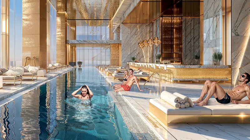 - 40+ amenities including infinity pool, aquatic gym, spa, yoga decks, and sky golf