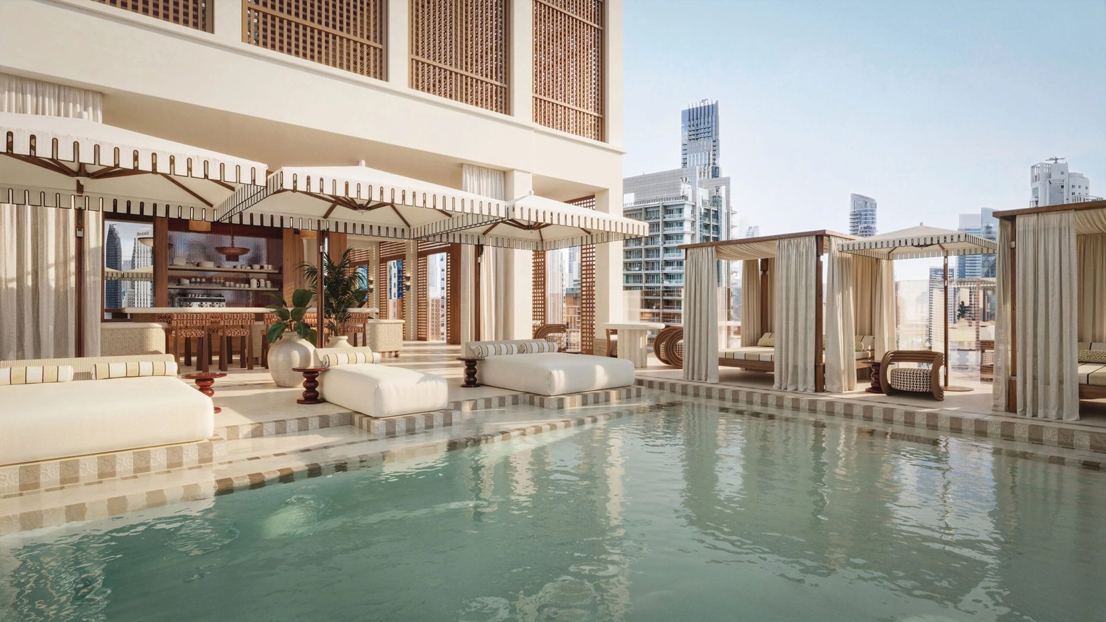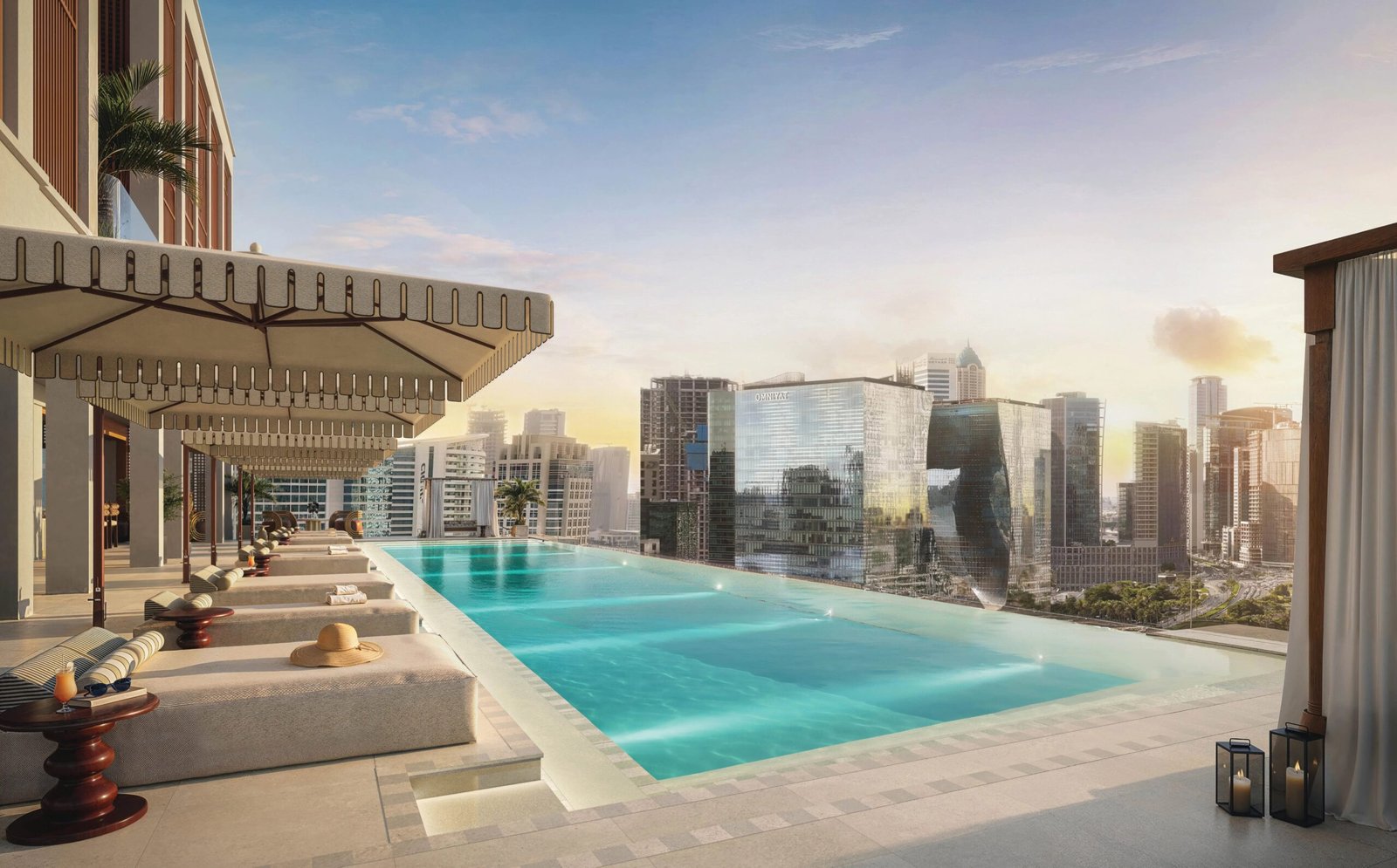 A luxurious infinity-style rooftop pool that offers panoramic views of Downtown Dubai and Business Bay.