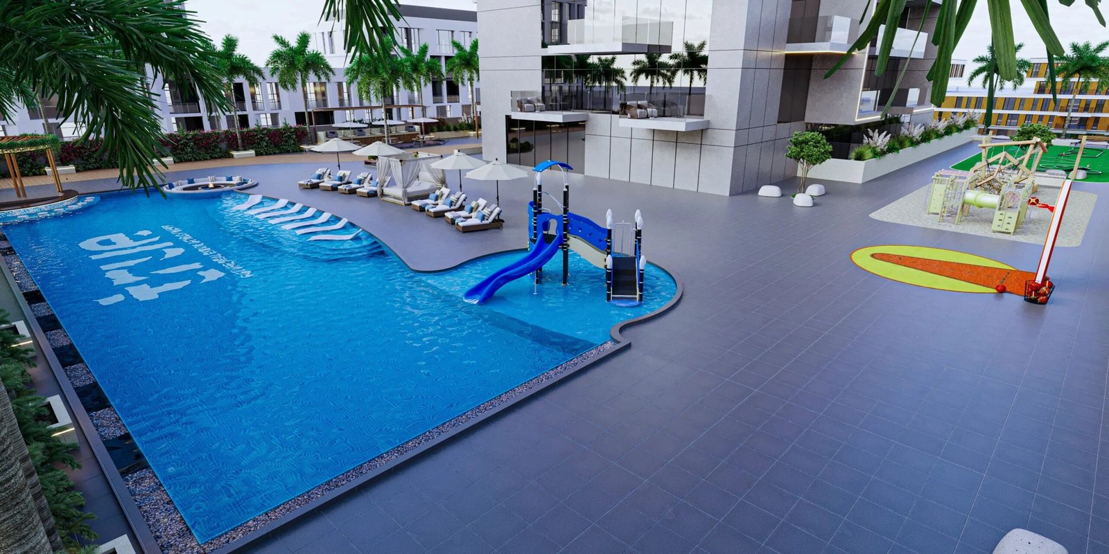 Amenities include swimming pools, gyms, mini golf, outdoor cinema, landscaped gardens, social zones, and more. -