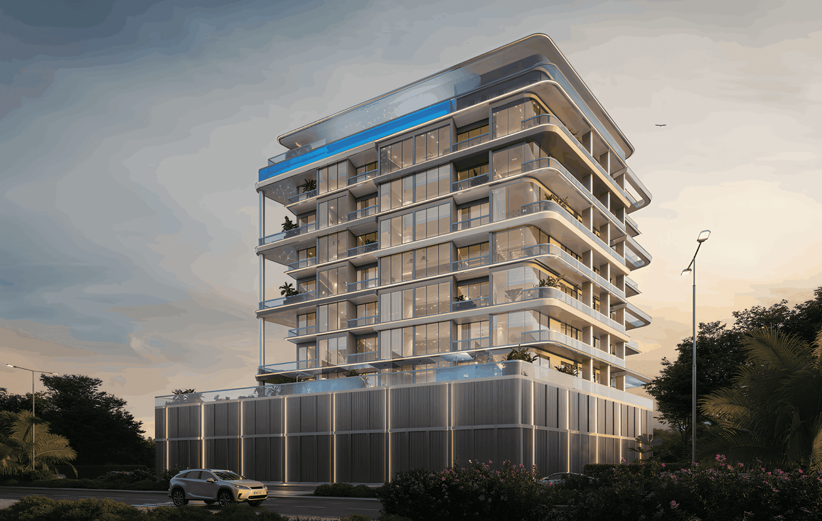 Infinity pool, gym, rooftop yoga, BBQ, coworking, cinema, spa, pet zone, and landscaped gardens.