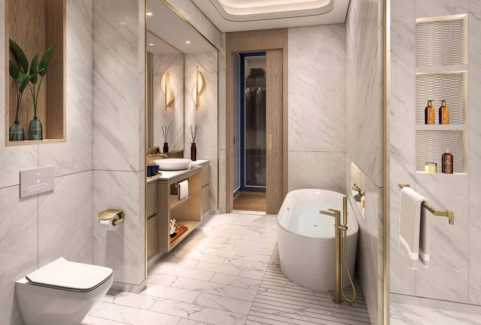 Apartments at Harbour Lights are inspired by the sea, featuring white and gold interiors, chandeliers, mirrored ceilings, and design aesthetics modeled after luxury cruise liners. The interiors are finished with beige and blue tones to match the surrounding maritime theme, creating a serene and visually striking environment.