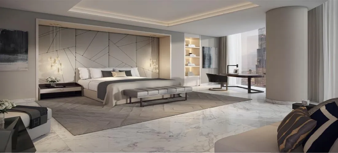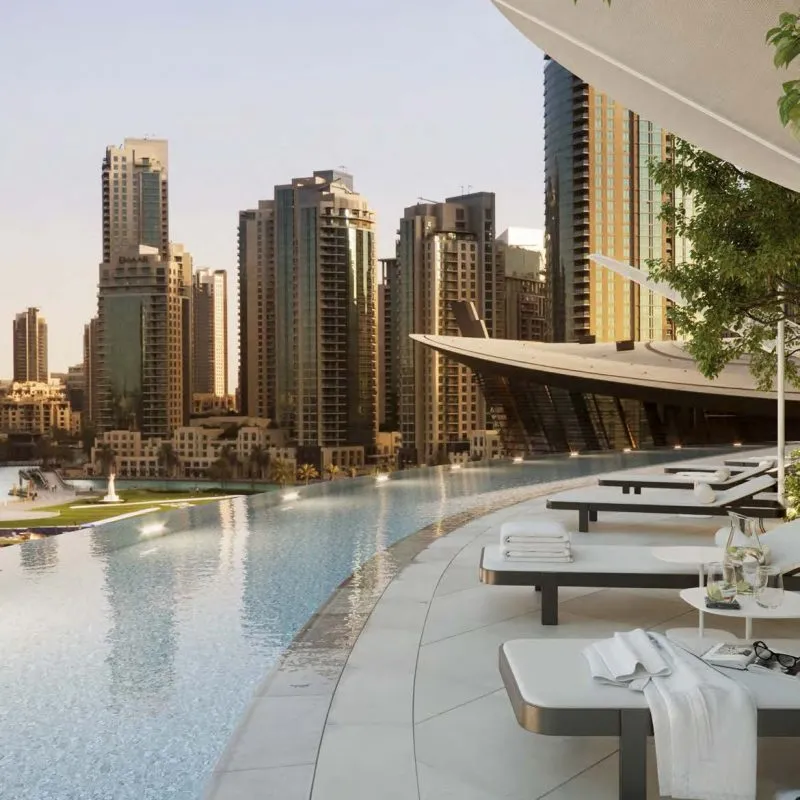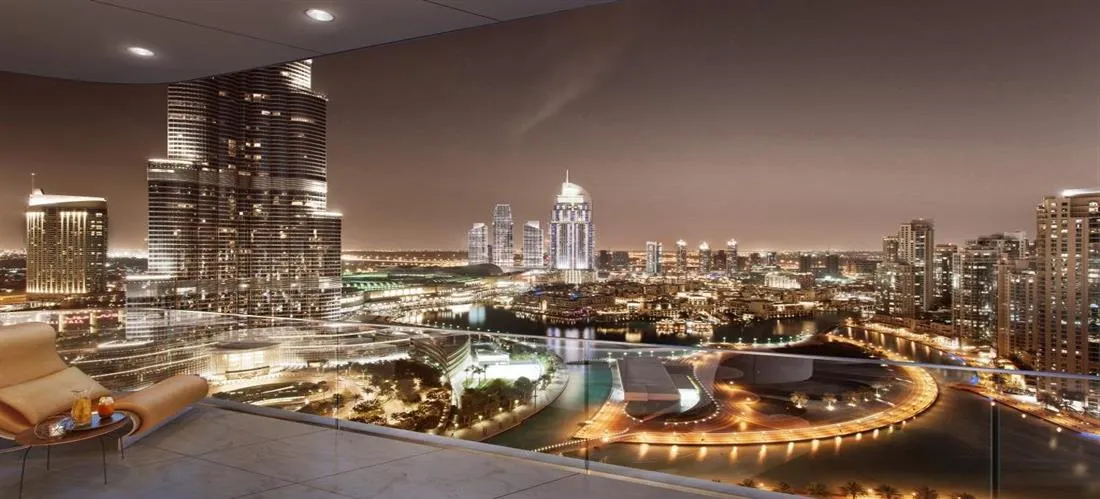 - Spacious layouts with panoramic skyline and fountain views