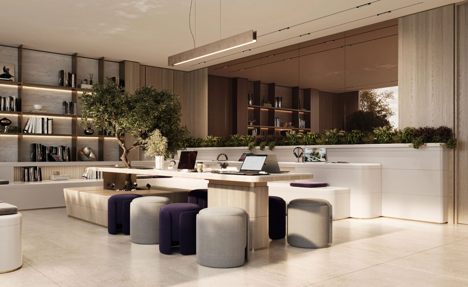 A welcoming lobby and a stylish lounge create a premium first impression with comfortable seating.