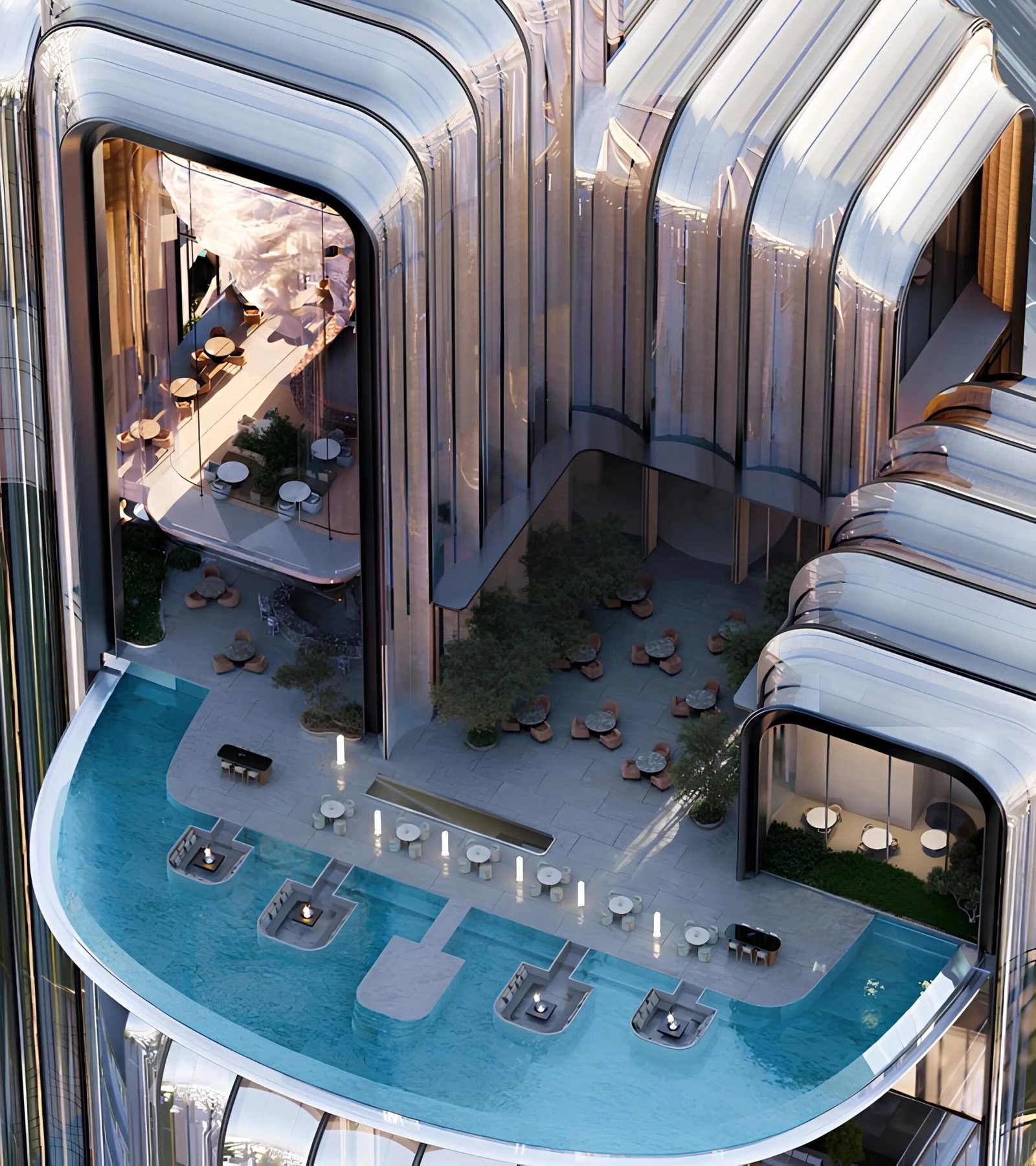 A temperature-controlled shared pool for residents and occupants.