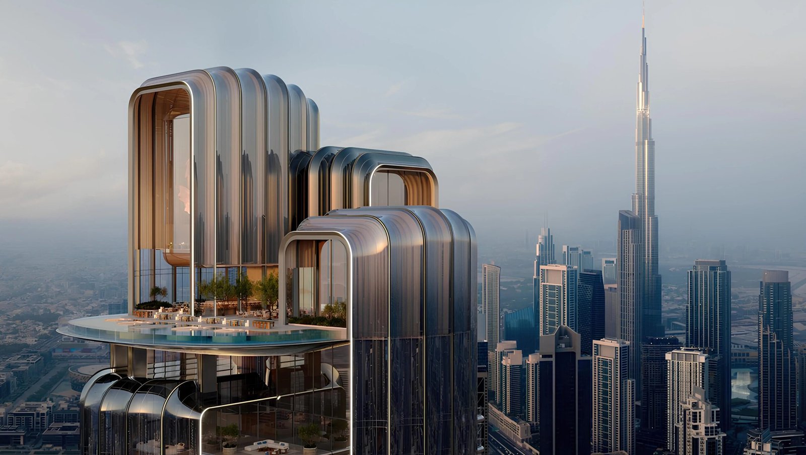 A luxury rooftop pool with panoramic views of the Dubai skyline.