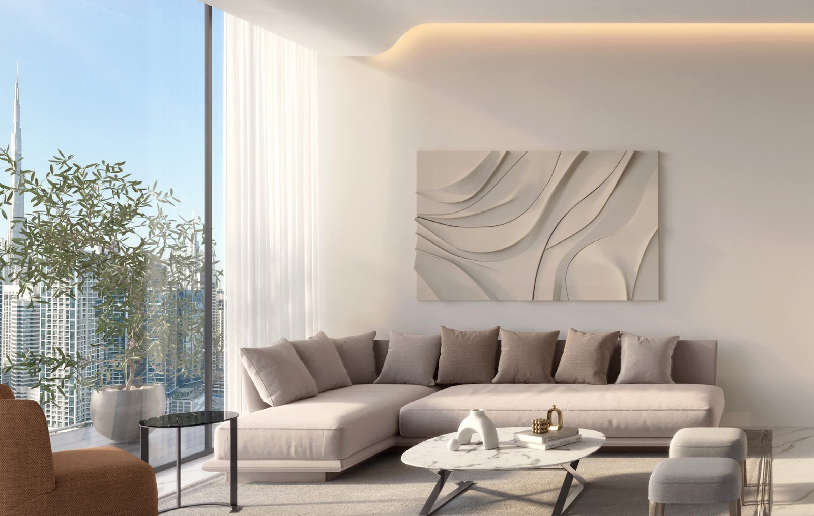 One of the most attractive features of Onda by Kasco is the emphasis on natural light and panoramic views. The expansive glazing not only illuminates the rooms but also offers breathtaking views of the bustling Business Bay district and beyond, including iconic Dubai landmarks visible on clear days.