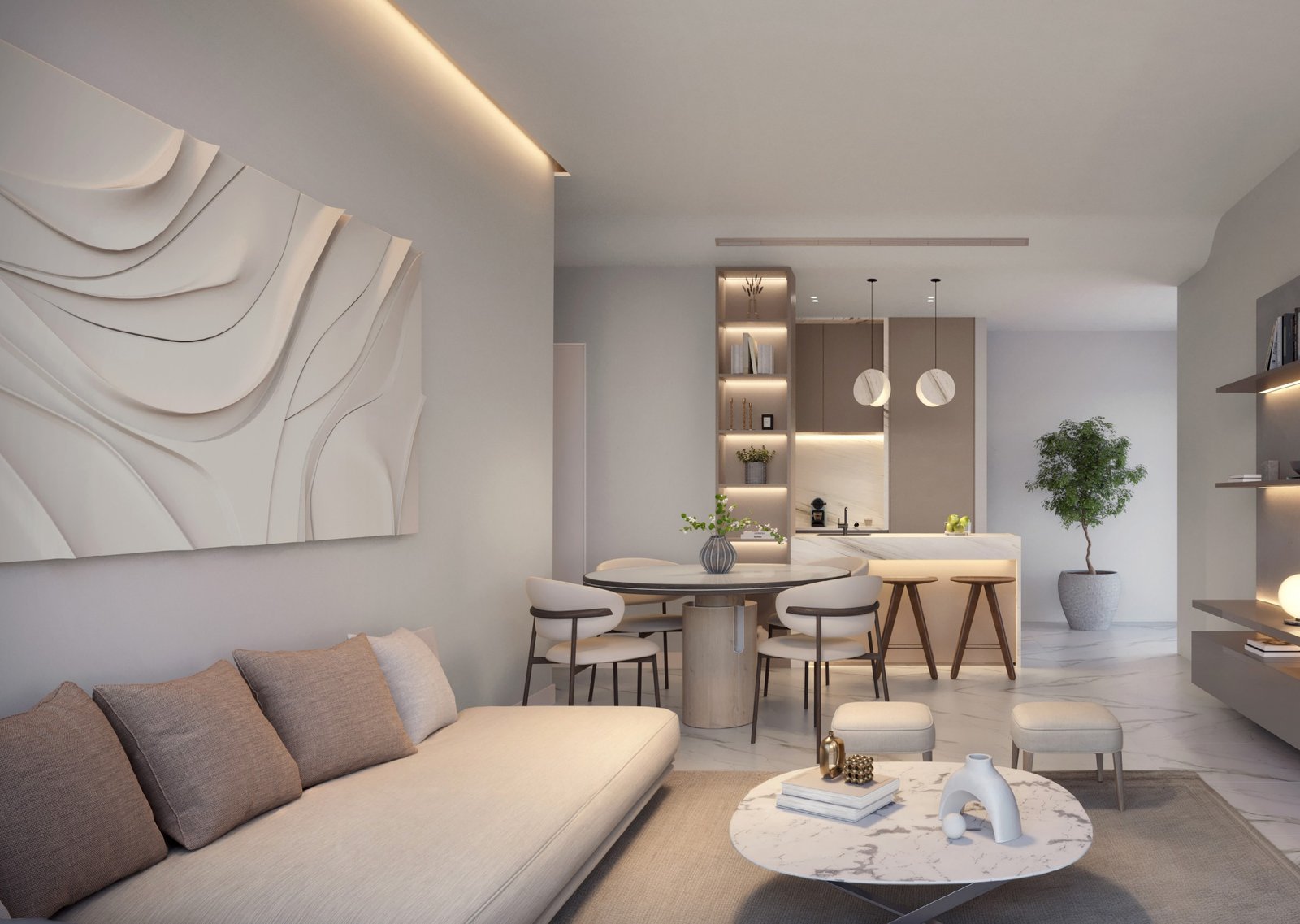 The apartments at Onda by Kasco range from studios to one-, two-, and three-bedroom units. These residences are thoughtfully designed to maximize space and comfort, featuring spacious layouts and panoramic glazing that allows abundant natural light to flood the interiors, creating a bright and inviting atmosphere.