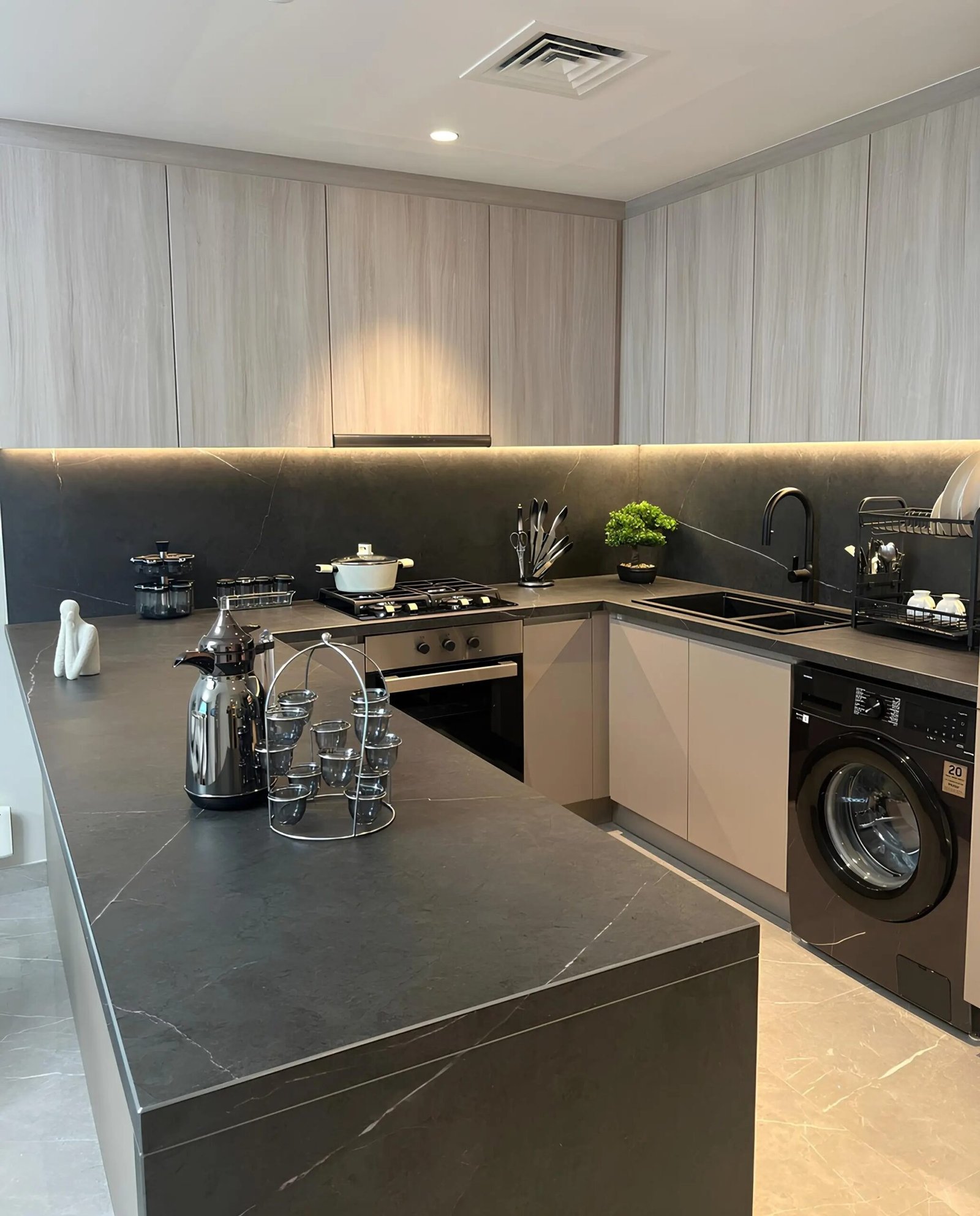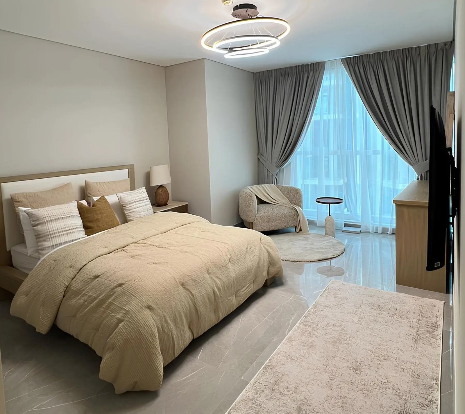 The project’s interiors stand out with subtle elegance — sleek finishes, modern lighting fixtures, and thoughtfully chosen materials enhance every corner. The wide glass windows create an airy feeling, while the balcony spaces invite natural light and stunning views of Arjan’s skyline.