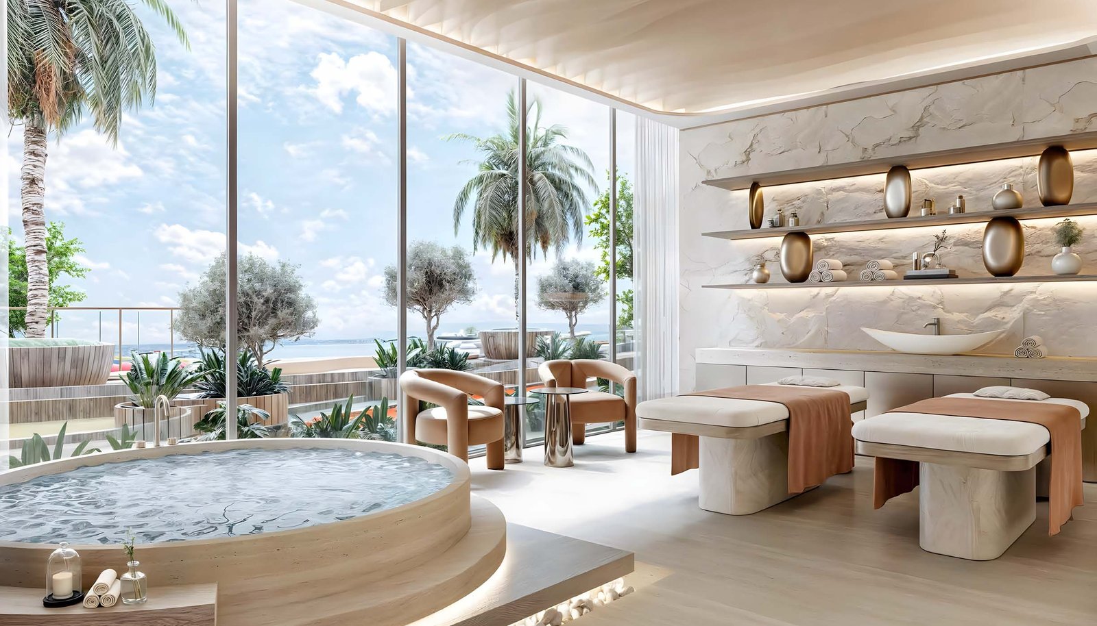 • Wellness spa with light therapy, hydrotherapy, and meditation dome
