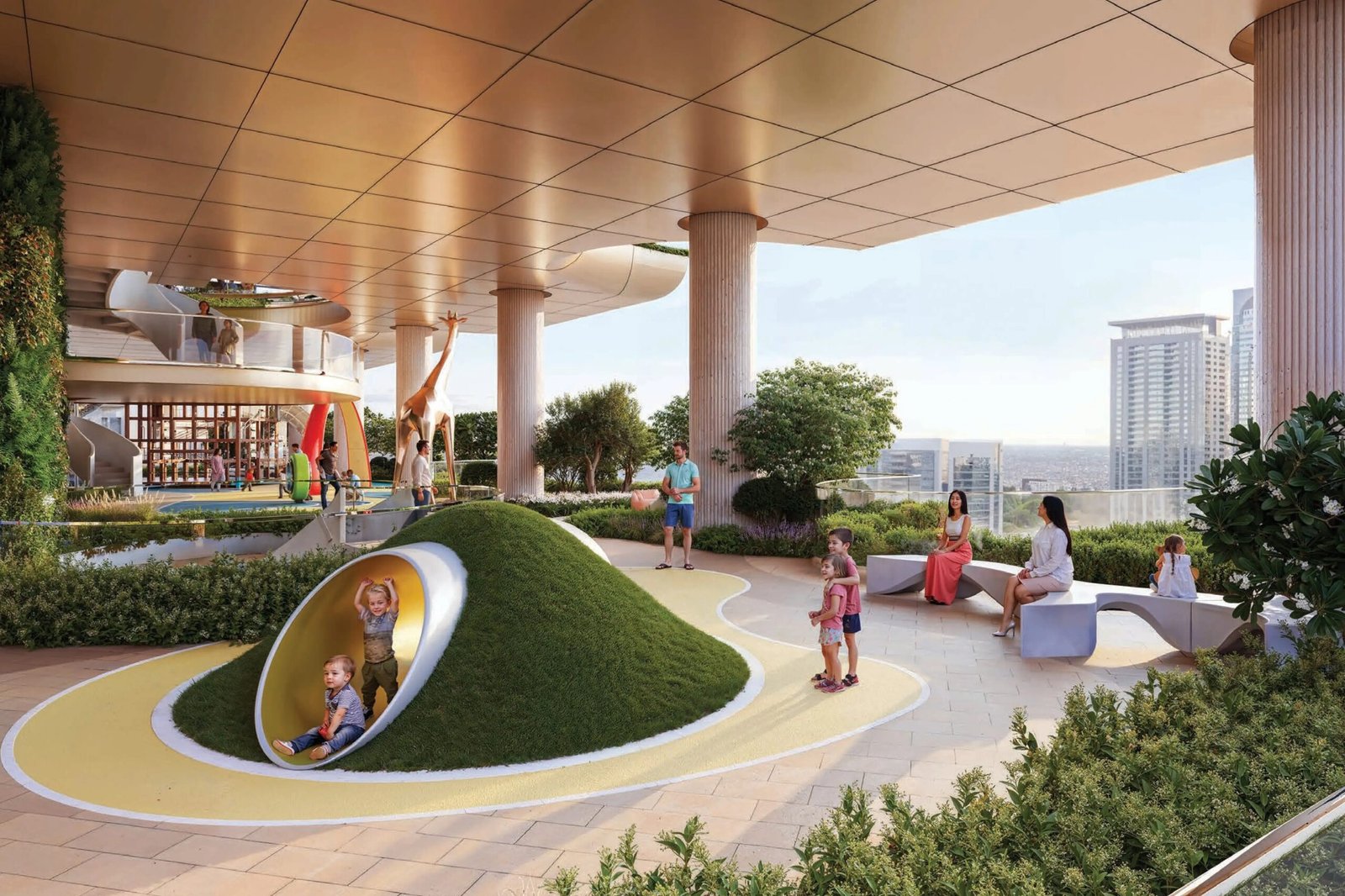 A 200-meter elevated jogging track allows residents to enjoy fitness routines with panoramic cityscapes as a backdrop.