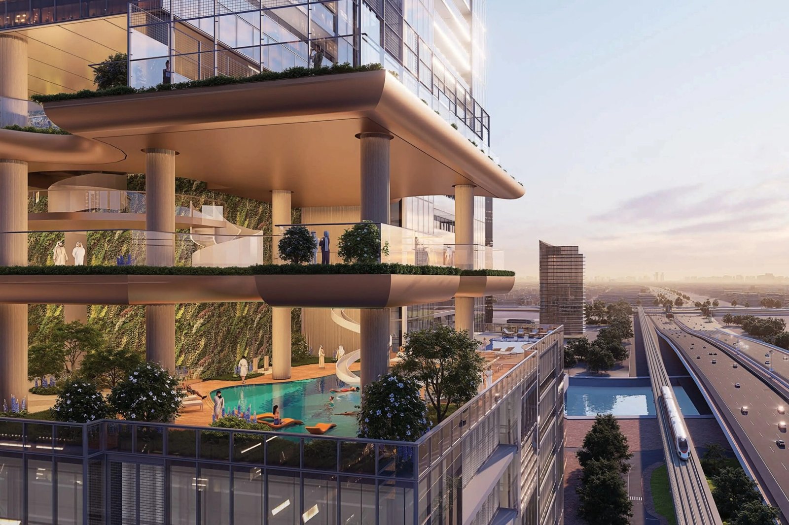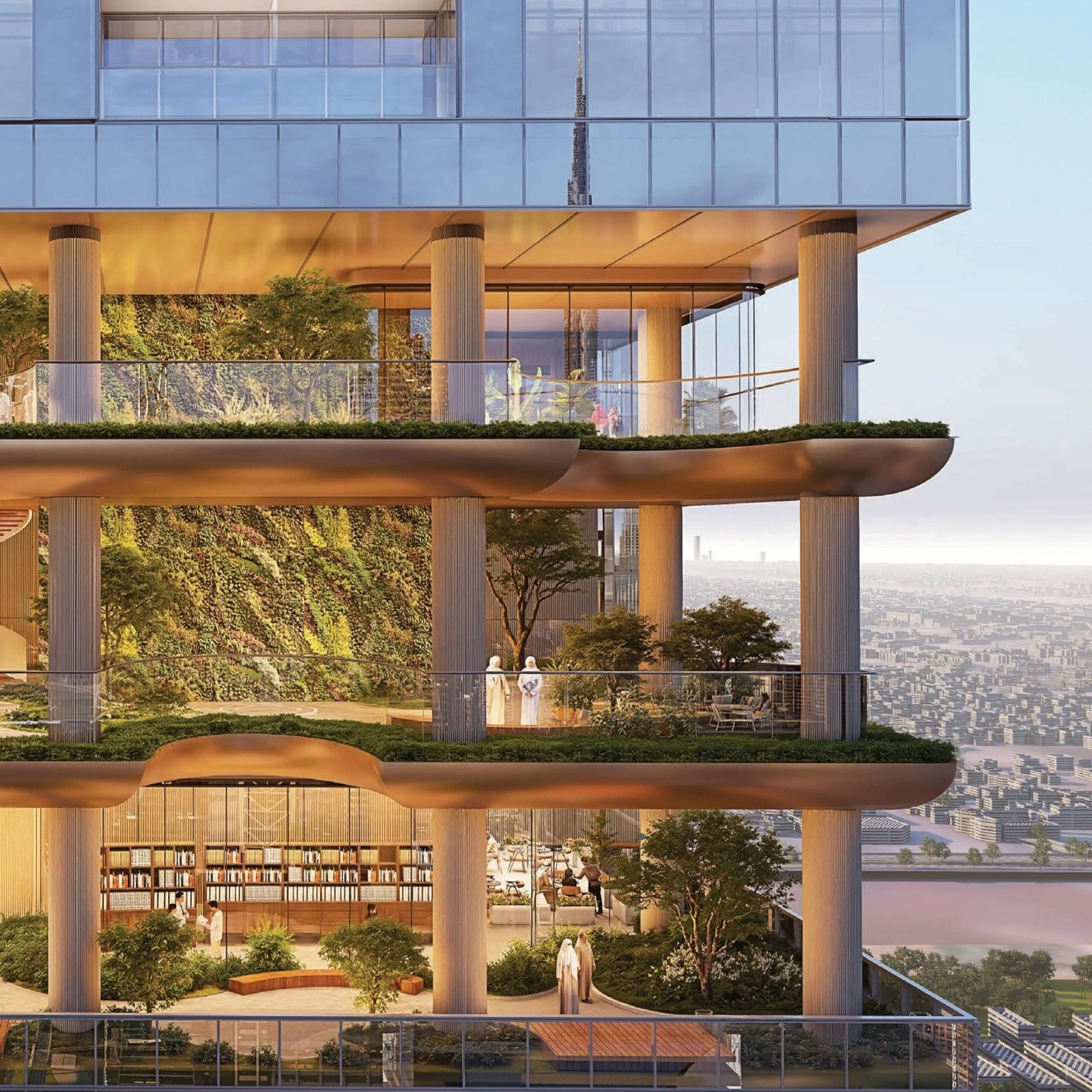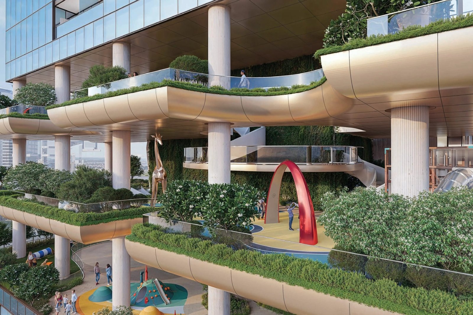 Four elevated sky gardens bring nature into the vertical structure, creating tranquil green spaces where residents can walk, relax, and enjoy the views.