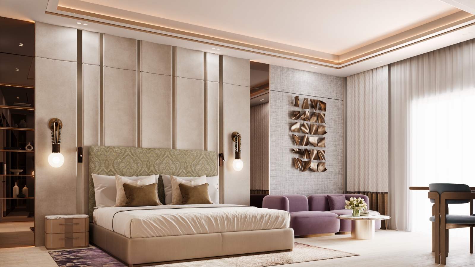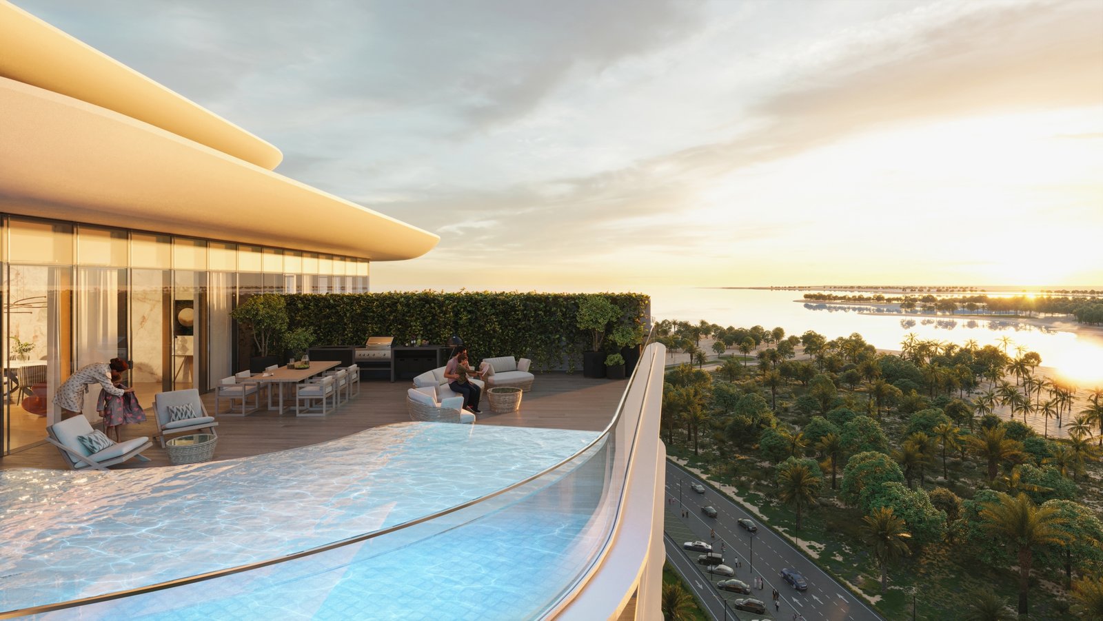 The architecture showcases curved twin towers with rippling balconies, designed to reflect the movement of the waves. Interiors blend warm tones, marble finishes, antique brass details, and bespoke design elements, evoking both heritage and modern refinement. Every home includes expansive French windows, spa-style bathrooms, and luxurious living areas.