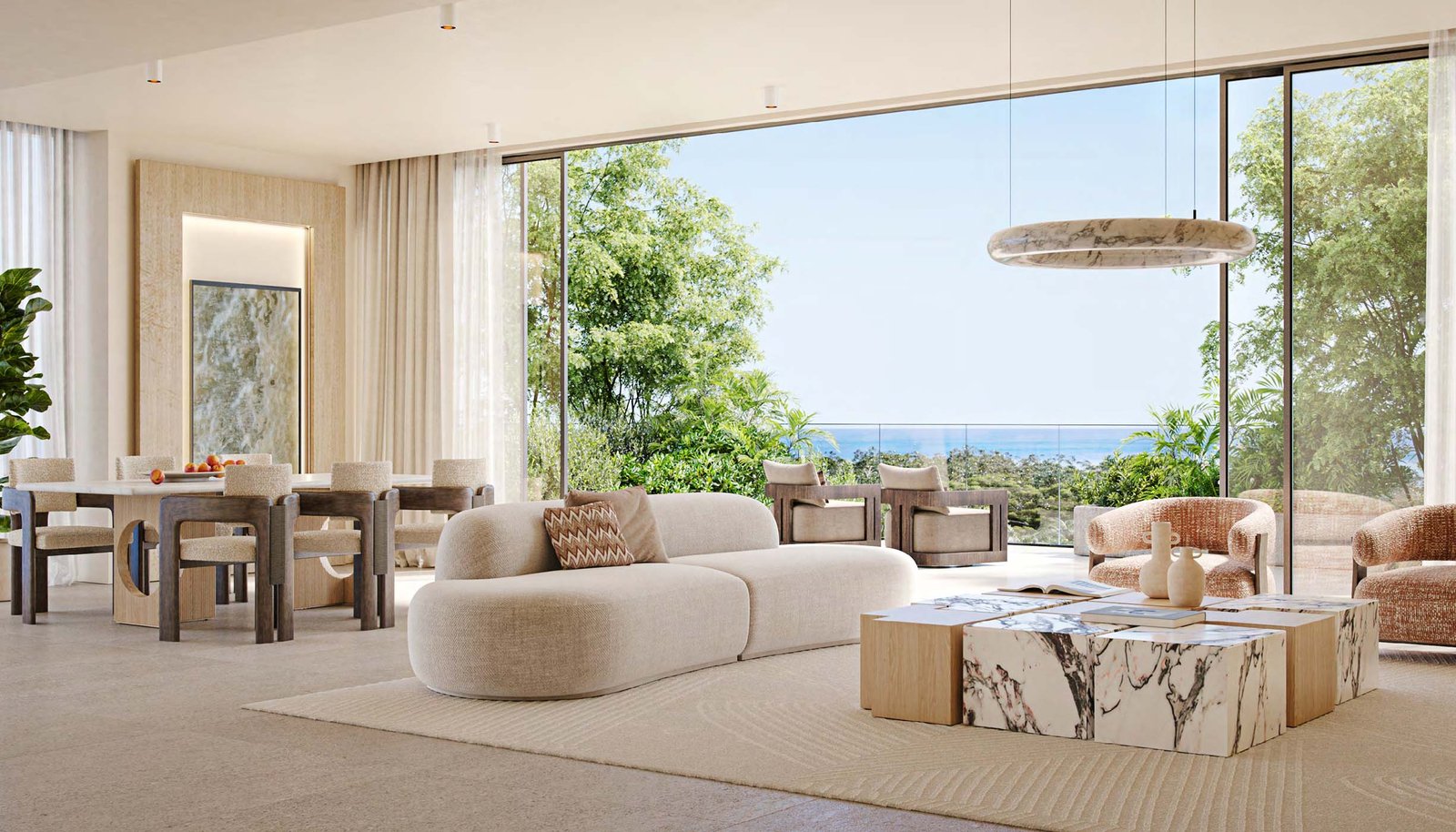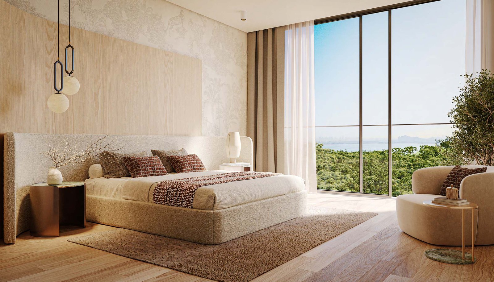 - Floor-to-ceiling windows and private balconies with park or sea views