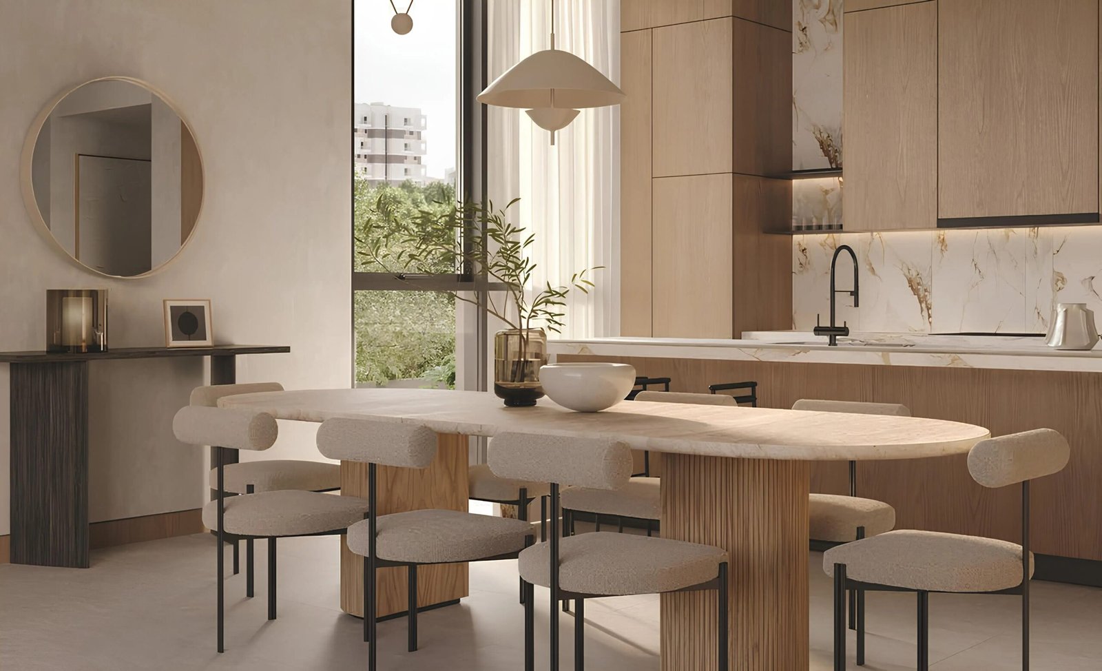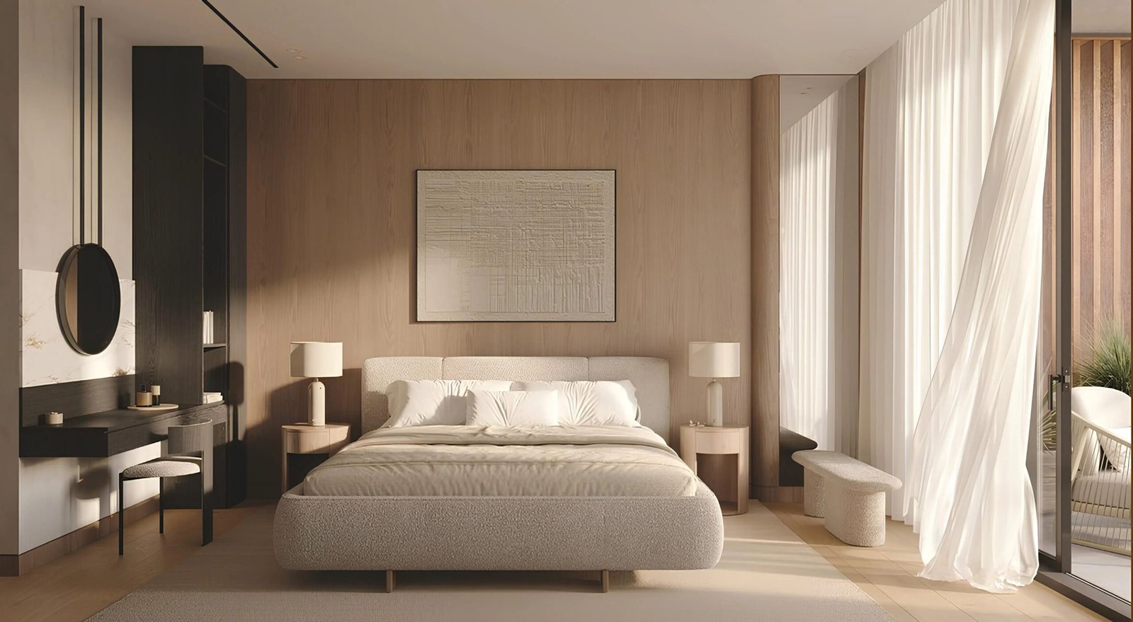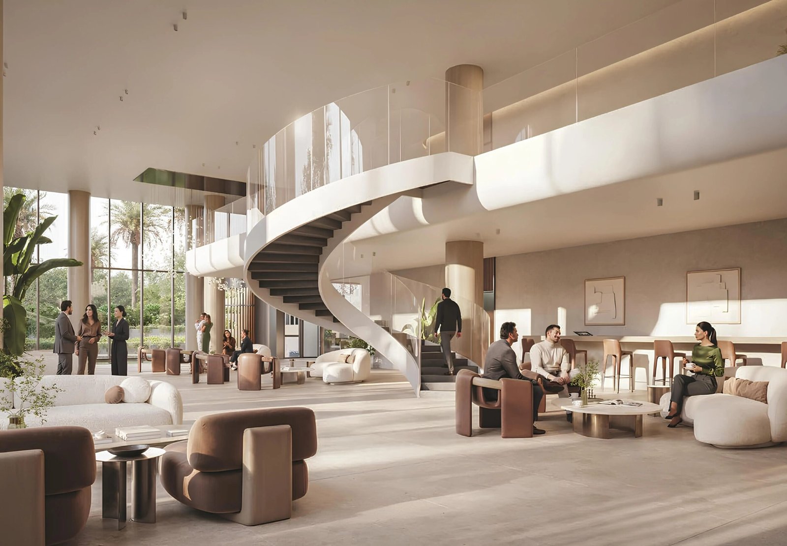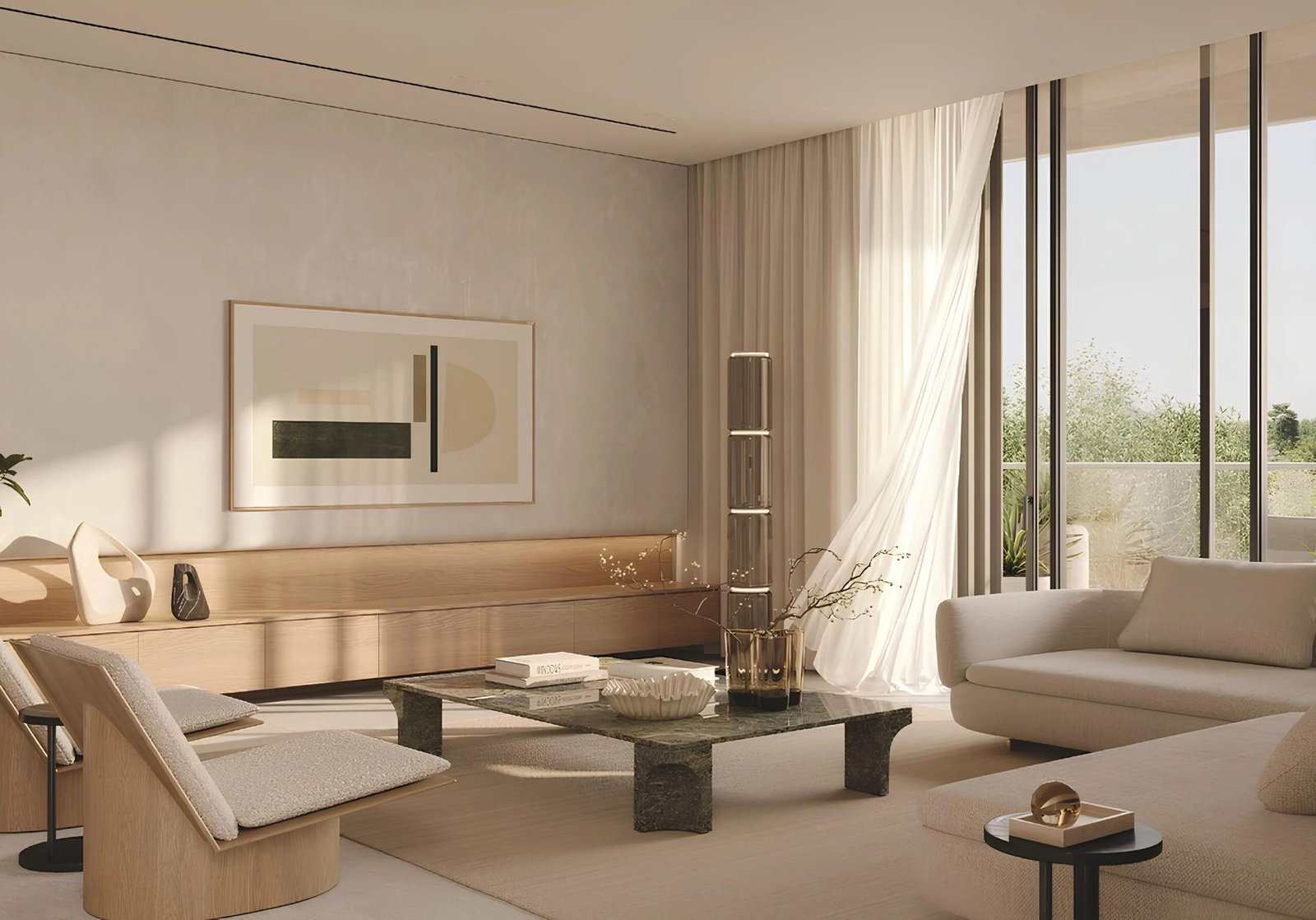 Inside the residences, the interiors follow a soothing palette of natural tones. Textured materials are used strategically to add visual depth and comfort. Spacious living areas create an inviting environment for family gatherings and personal relaxation alike. The bedrooms offer a peaceful retreat with thoughtfully positioned windows that frame the green vistas of Al Barari.