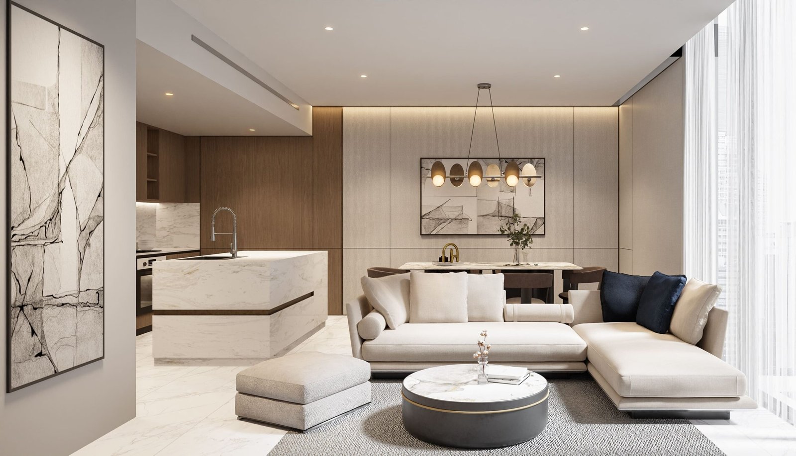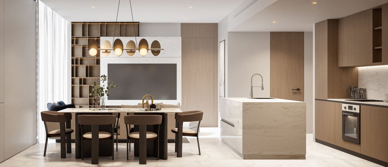 Each apartment has been crafted with attention to detail, offering warm interior finishes that create a calm and cozy ambiance. The open layouts maximize internal space, while large windows bring in abundant natural light and offer captivating views. Bathrooms are designed with premium sanitary ware, soft lighting, rain showers, and functional layouts to enhance the everyday living experience.