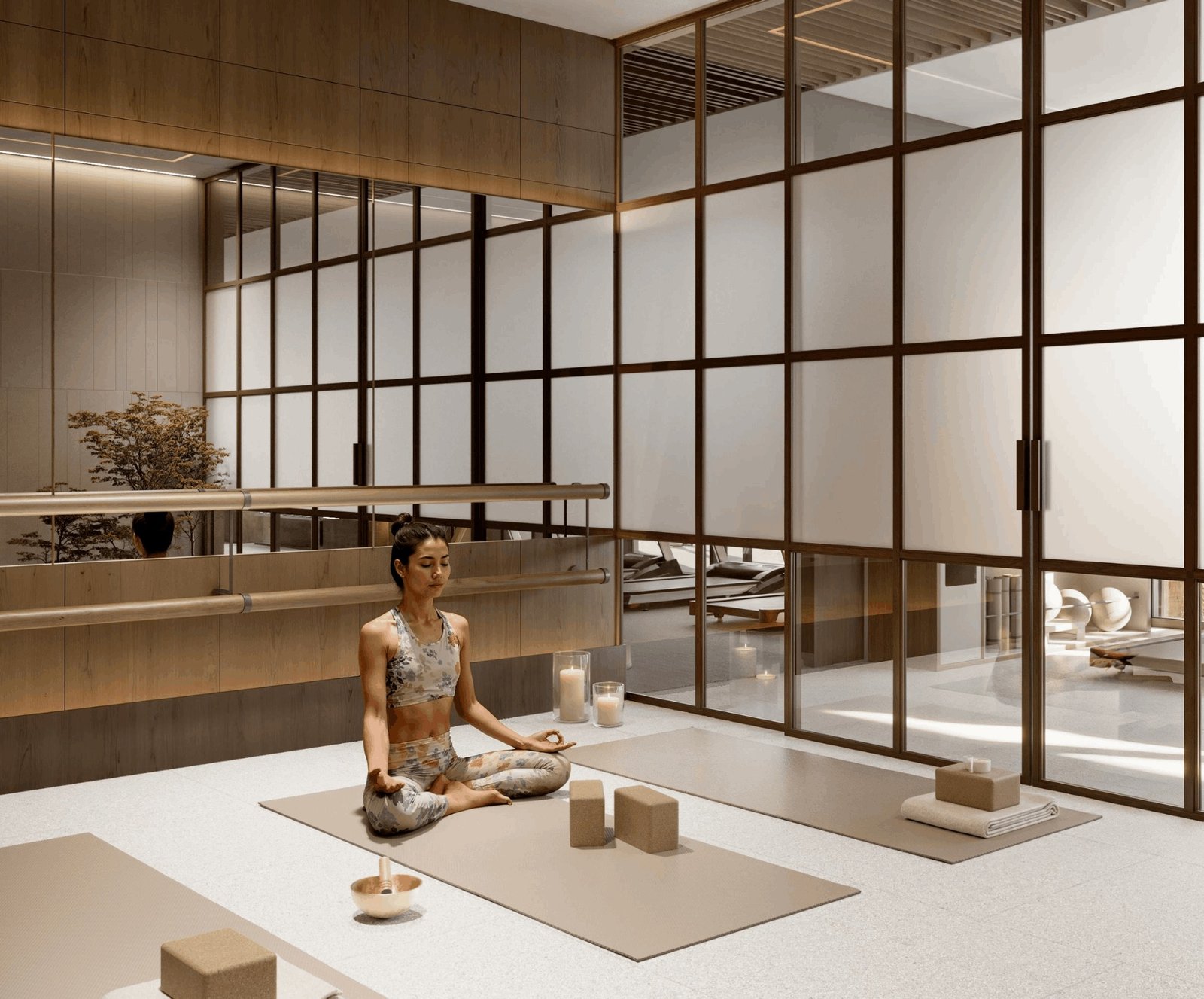 The Yoga studio offers a peaceful environment for residents to practice mindfulness and wellness routines.