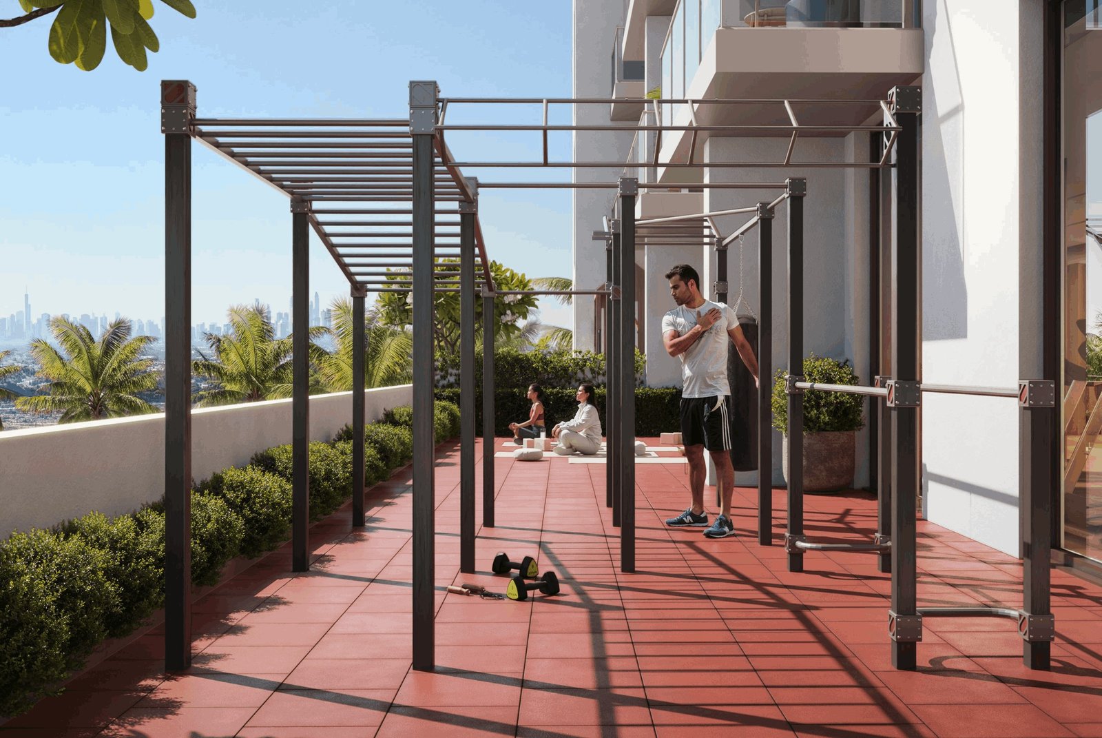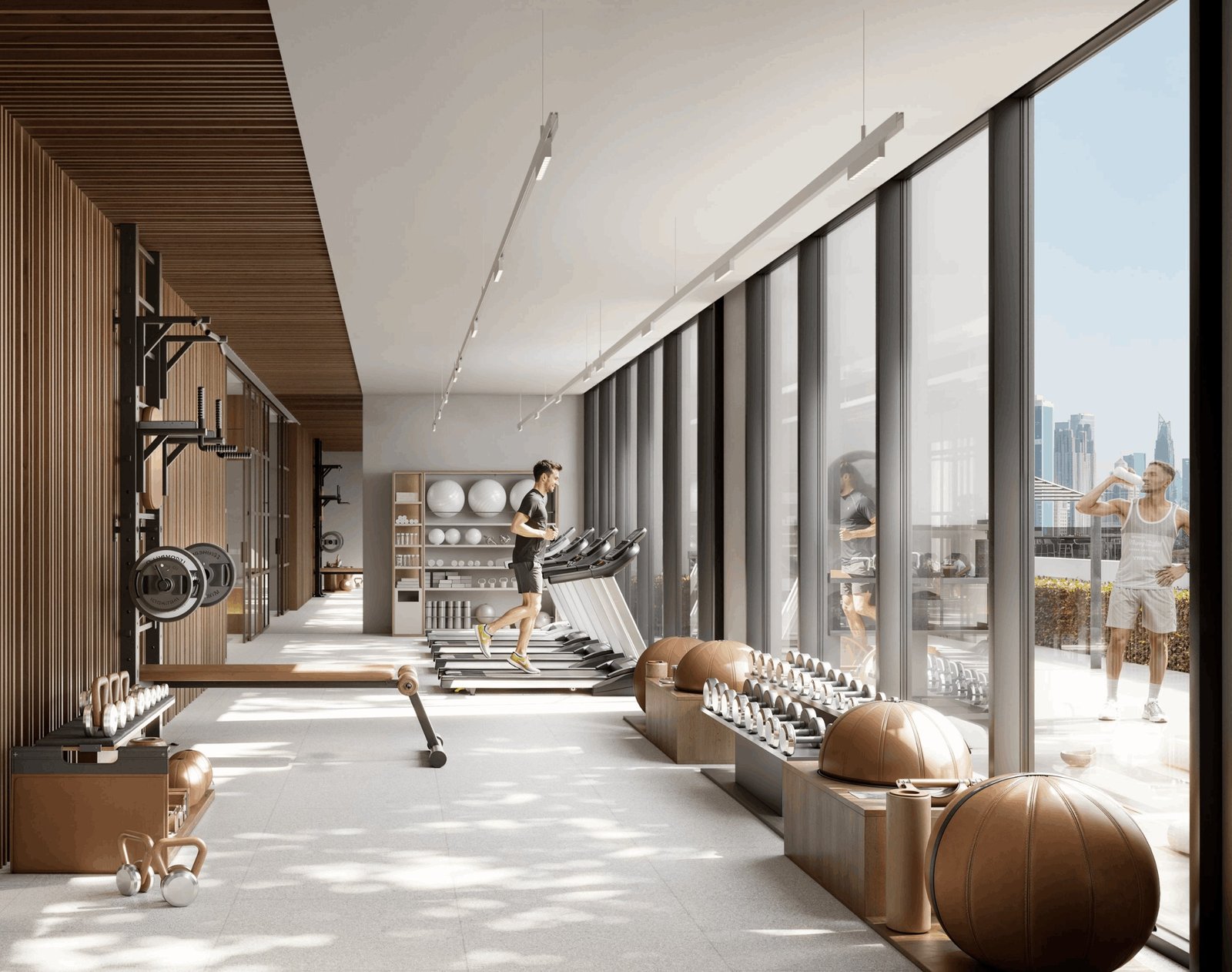 A well-equipped gym under a covered zone provides year-round fitness access with modern machines and exercise spaces.