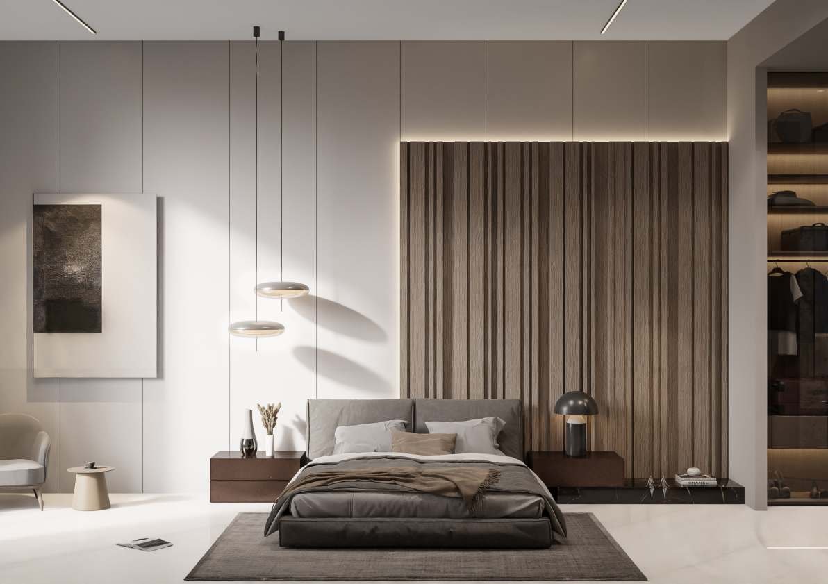 Interiors: Natural tones of beige, walnut, and travertine with a focus on minimalist yet elegant design.