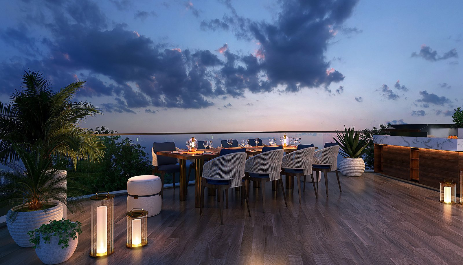 - Rooftop lounges with BBQ pits in villas