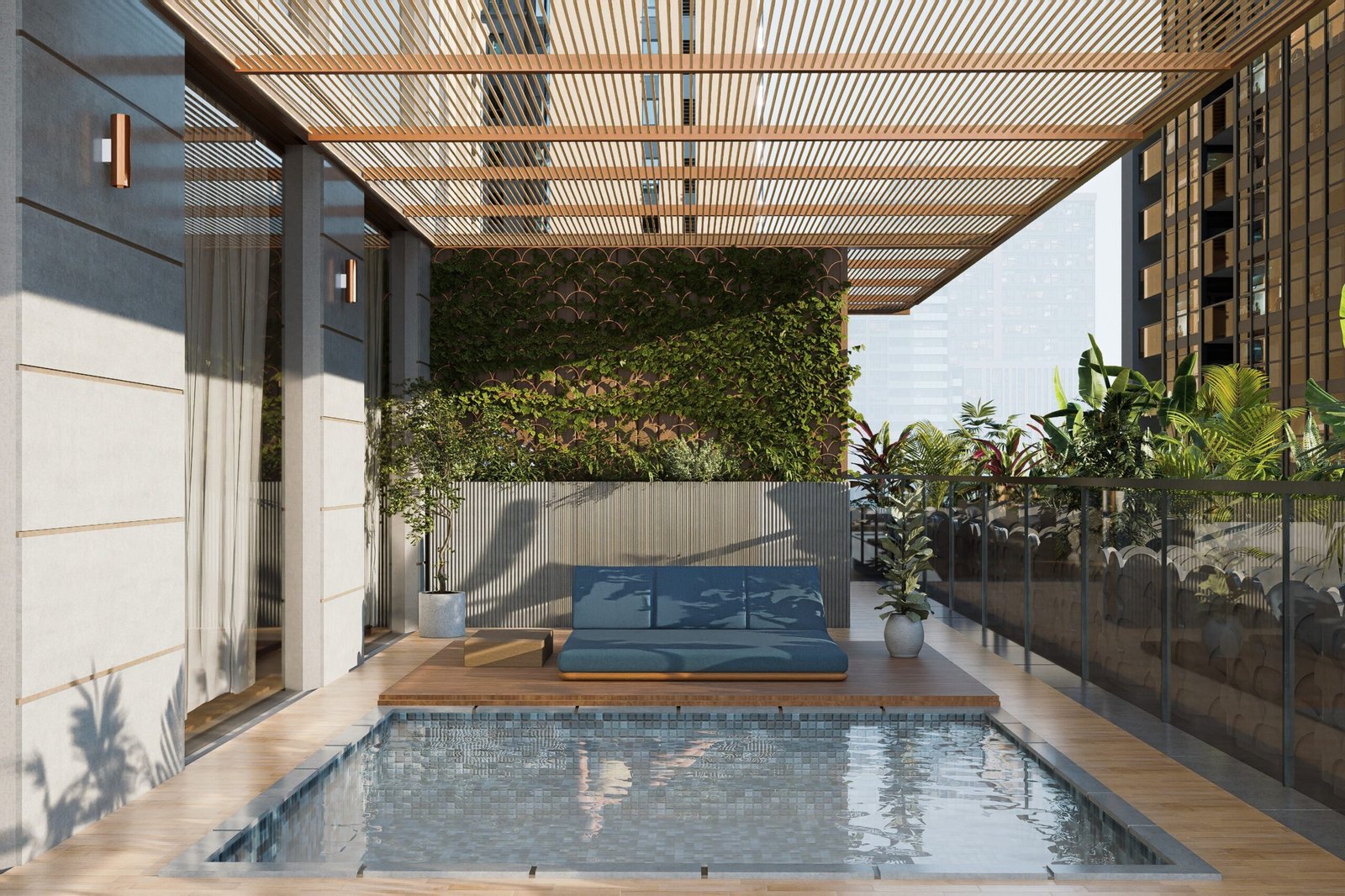 The rooftop pool area provides luxury living with stunning skyline views.